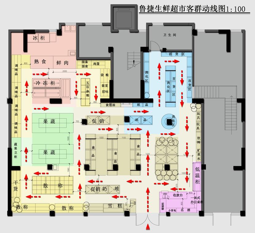 一、平面規(guī)劃:平面布局中重點(diǎn)考慮了本項(xiàng)目的建筑類型,物業(yè)形態(tài)以及項(xiàng)目所在的社區(qū)的客群,消費(fèi)能力,結(jié)合超市固有的特點(diǎn)(如裝修風(fēng)格定位、貨架的樣式、貨架規(guī)格,購(gòu)物通道大小等的設(shè)置)并考慮超市客群動(dòng)線的合理性和適當(dāng)延長(zhǎng)以及有意避免因建筑戶型限制而形成的購(gòu)物死角,